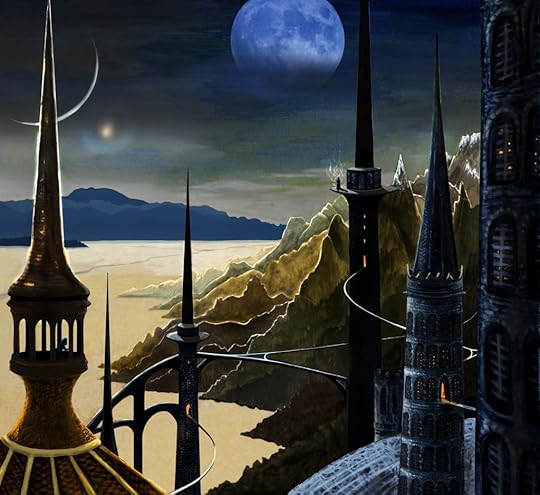 I've been fortunate over the past two years to work with Rhys Davies, an up-and-coming cartographer and illustrator of books. Readers of Spellwright are already familiar with Rhys's work in the form of his map of the Six Human Kingdoms that appears in the book. Lately, I've been working with Rhys on a map of the city of Avel, which is the seat of most of the action for Spellbound–we've a way to go before we can share it, but I can guarantee, it's going to look _very_ cool. Meantime, Rhys has been expanding his repertory with some illustrations of Starhaven from Spellwright. The perspective and color scheme remind me of some pieces by Rodney Matthews and Roger Dean. Check out Rhys's work !