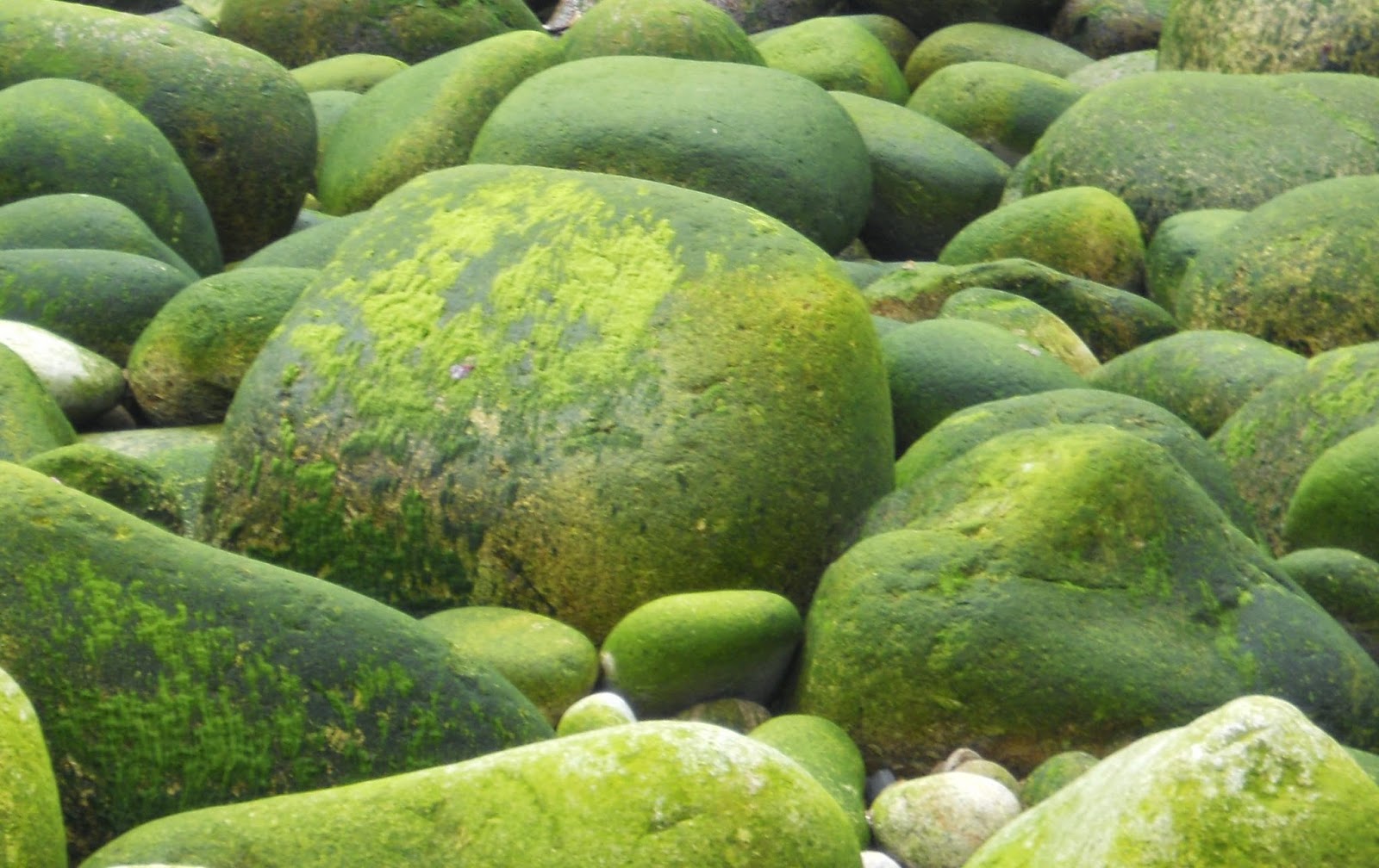 The picture above holds its own story. Anything super green tends to catch my eye - broccoli, the Faery tradition, emeralds, algae covered rocks - all those and more. So when we were walking on the beach and I saw them, how could I resist? No matter that the rocks were unstable and only an idiot doesn't have two hands out to steady themselves, right? That picture is the last one the camera ever took. Shortly afterwards it - and my elbow - had a close encounter with a couple of boulders. Memory cards are surprisingly robust these days, don't you think? It must be something to do with the manufacturer's formula...