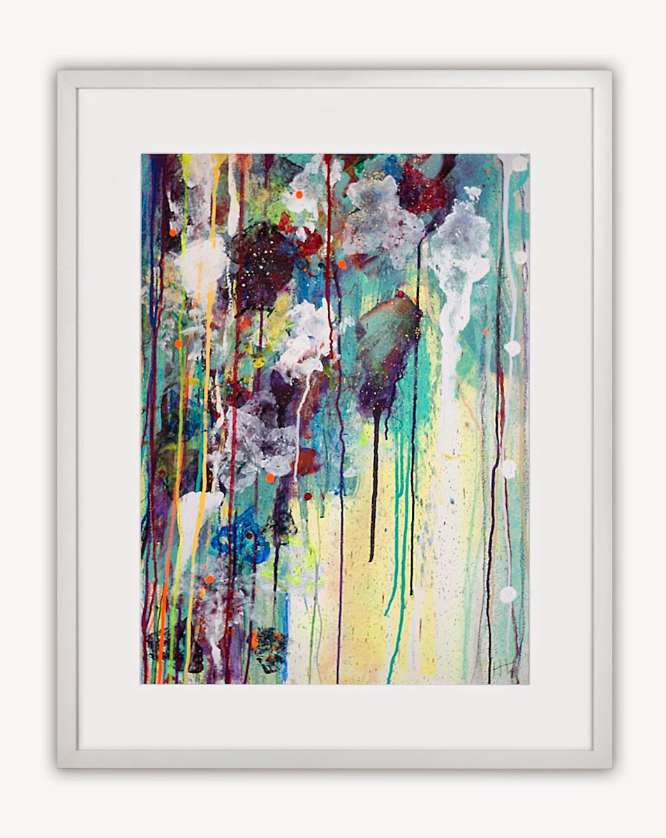 My current workspace is a part wood, part brick built out-house on the side of my Dad's house in Richmond, London. It is pretty small, maybe 3m x 5m and it has a clear plastic roof which makes it fantastic in terms of light. I am a very messy painter so it is absolutely covered in a multitude of splashes and drips of different coloured paint. At either end of the space, are shelves where I keep all of my paints and brushes. I paint against the wall - fixing the paper to the wall and working standing up. By standing, I find that I can move my body more freely and can be more reactive and expressive. In an ideal world I would love a really big studio with lots of space as I love working on multiple paintings at the same time.