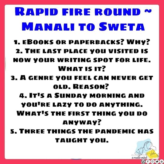 Find out the answers hereAmong other things, Sweta wanted to know about my books and writing too. So her questions focused mainly on these things.