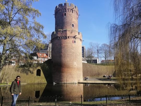 Photo by the author| My husband posing in front of the tower and pond at KronenburgerparkInside the park, there is a small pond that has two parts divided by a bridge. The pool has numerous ducks, geese, and some big as well as small fish.