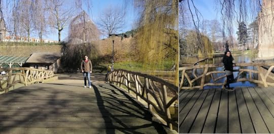 Photo by the author | My husband and I posing on the little bridge inside KronenburgerparkAt the top of the park, after a small uphill climb, there is a small playground for young children and a petting zoo. One can find deer, land goats, peacocks, and chickens as the permanent residents of this enclosure.