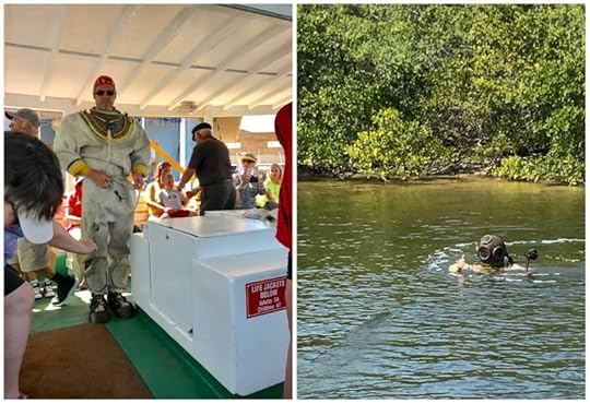 After my proposal was accepted by the publisher, I read a number of books related to sponge diving in Greece and Florida. I also traveled to Tarpon Springs to view the community and learn more about diving during the late 1800s and early 1900s. During my visit, I had the opportunity to go out on a sponging boat and watch a diver don one of those ancient helmets, old canvas diving suits, and heavy metal boots before he jumped over the side of the boat and soon reappeared with a sponge on his hook. Observing an actual dive in one of those old canvas suits will go down as one of my most memorable research activities.