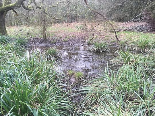 I was looking at one of the ponds (pictured) – much of the common is a quagmire with lots of lying water and small ponds. The mud and clay mean the ponds are not very inviting, except to dogs, but there’s a whole ecosystem there about which my knowledge is very limited. To my eyes it looked a mess – the photo is flattering – but from the mess springs life. Maybe over the next few weeks I’ll find out more about that life.