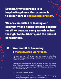 At Dragon Army, we are committed to our Purpose of Inspiring Happiness. And we recognize that unless we put the full weight of our company into doing our part to fight systematic racism and white supremacy, we can’t possibly expect to inspire much happiness.