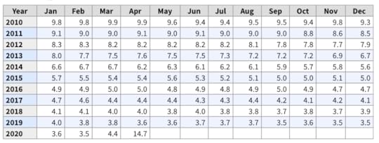 Unemployment % by month over the last 10 yearsThe world’s a mess, and we’re bombarded with terrible news reminding us of just how bad it is. Here’s the ‘front page’ of The NY Times as I write this: