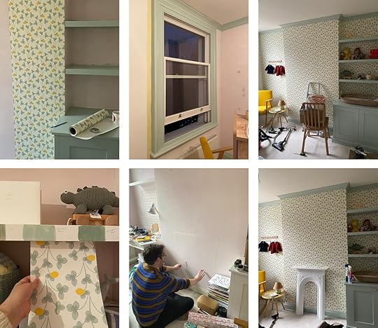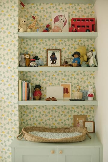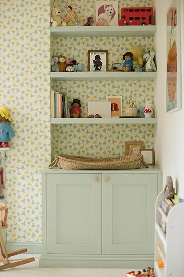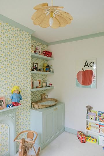 (Changing Basket, Changing Mat, Rocking Horse, Gingham Pyjamas, Letter Hook)Plus, I’ll be honest here and say we also enlisted the help of our very talented interior-design friend Sam at this point (and Papa P on wallpaper duty), who helped guide us through all the things we were unsure about- from whether to wallpaper the whole room and how that could make it feel smaller or bigger, what colour to paint the cupboards (we settled on Aquamarine Mid by Little Greene for the woodwork and Farrow & Ball’s Slacked Lime for the walls), what colour curtains might work and how to make things practical for the space as well as pretty. She did such an exceptional job and suggested the idea of filling the chimney breast with a faux fireplace too, which I’d never have thought of but absolutely love. We have a fireplace downstairs but were quite unsure about how to use this central space, but by picking up a second-hand surround on Etsy, loved how painting it and fixing it to the wall gives the room so much character, and makes it feel really fluid with the rest of the house.