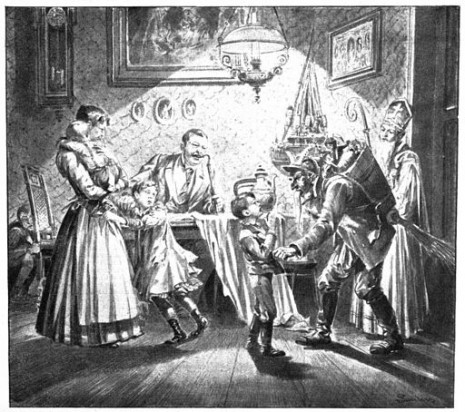 Middle: Krampus and Saint Nicholas in a Viennese home, 1896,
