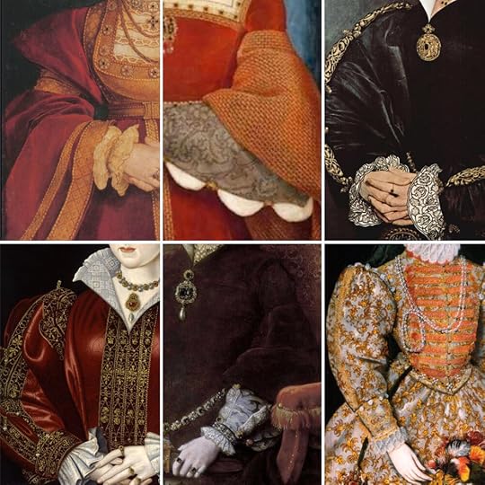 Sleeves: All Tudor women would have worn long sleeves coming down at least to the wrist, and sometimes below that. These long sleeves, or elements of them, at least, are seen in the costumes of Catherine of Aragon, Jane Seymour, and Katherine Howard.
