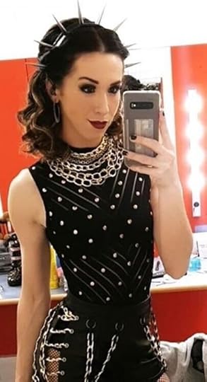 The black crop top with red trimming has been replaced with a MAGNIFENT red top (longer than her previous crop top with lots of silver studding, a mini faux black corset, lots of silver chains draping everywhere, and magnificent sleeves made up of gridded silver studded red leather strips. I wish I had a picture of this so badly, as it doesn’t show up as much under her jacket, but when she strips in her song, it’s super visible and AMAZING.