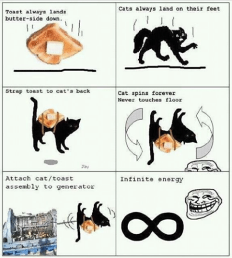 One of my favorite memes relating to this is the "the buttered cat paradox" - cats always land on their feet, buttered toast always lands buttered side down, If one attached a piece of buttered toast (butter side up) to the back of a cat, the experiment will produce an anti-gravity effect. This buttered cat can thus be used to produce energy.