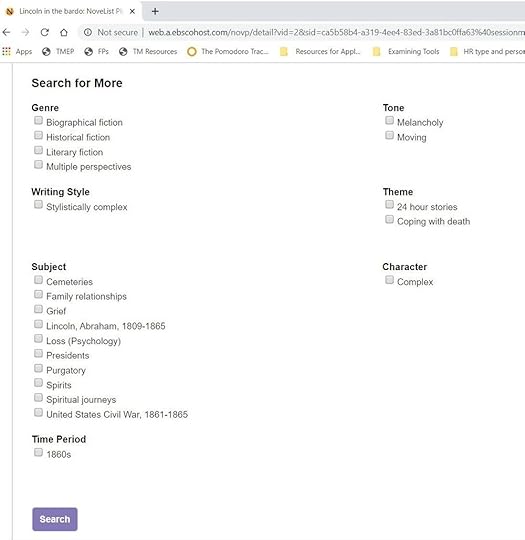 Librarian Kylie Sparks got back to me first, suggested a few authors and titles, and also recommended I look through Novelist Plus, another resource offered by the library. I was SO excited to learn about this website, which categorizes books by appeal terms (e.g., fast-paced, sweeping, richly detailed), genre, time period, and subject. What’s especially helpful for my purposes is that you can limit your search results by publication date! This wonderful website sent me down many winding rabbit holes and helped me find about 20 more books I’d like to read ASAP.