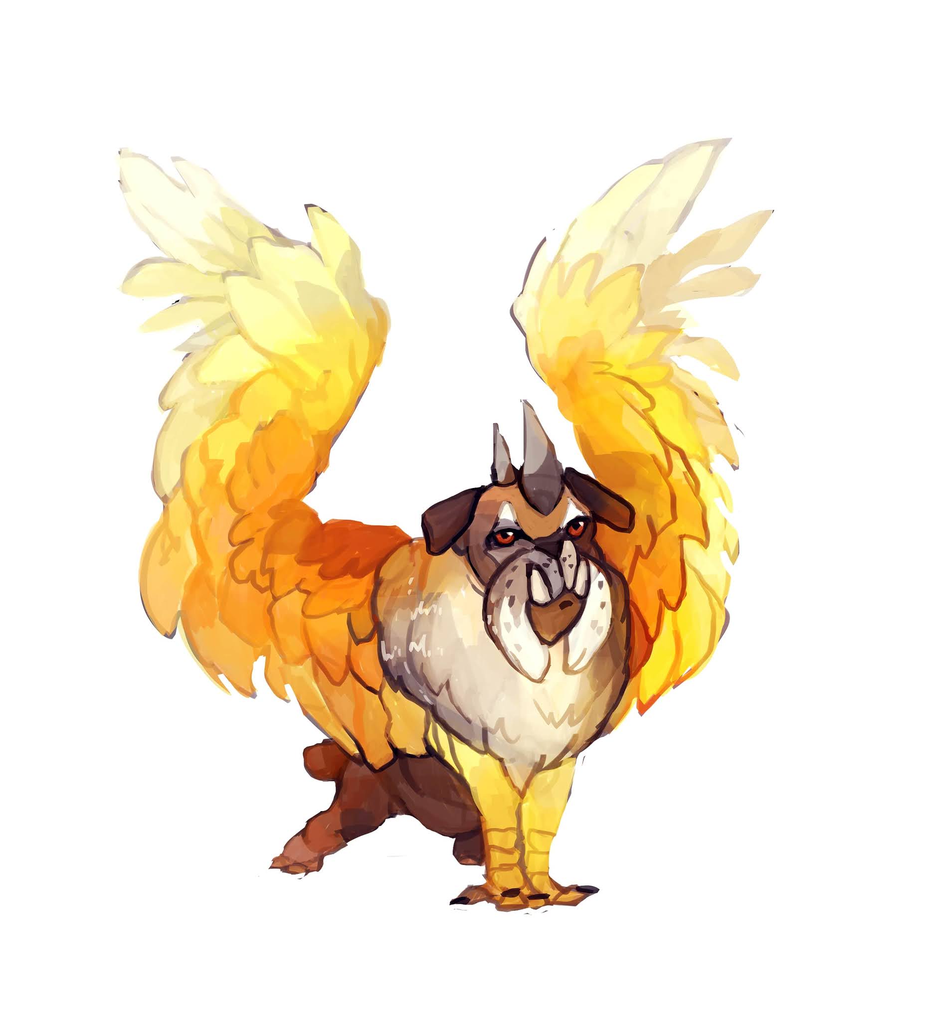 Owing to their flatulent nature, a group of bullgriffs are collectively known as a 'stench'.On the land bullgriffs go: "WOOF!" In the air they do their best impression of an eagle (spoiler warning: it's not a very good impression)The Pundlians have an ancient law that means a person of "lowly earnings" must lay down in a puddle whenever a bullgriff has to cross one. Pundlians have a real thing for forcing the less fortunate to humiliate themselves in the name of vapid symbols of patriotism.