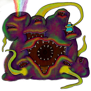 Another question people ask is "Why? Why have this murderous abomination on your airship?" The answer is that as a result of eating all that crudemana, magick regularly explodes from Gob-Nommoth's head (or from 'its top', anyway. Obviously it doesn't really have a head, although it does have a 'void hole' - an unholy cross between a nostril and an anus).