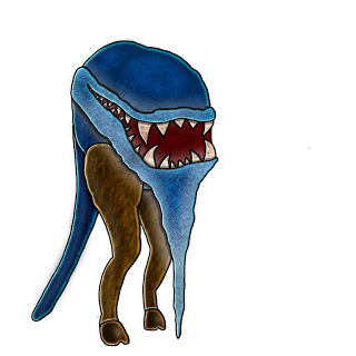 Hill glaciants combine the sure-footedness of a goat with the ferocity of a tiger (and the body-shape of a tadpole). Anyone visiting the Yelp Mountains will see these beasties on distant rock faces - traversing the most minimal of footholds on the most vertical of cliffs. They may also see one flanking them from behind. They won't see this for long, however, as the glaciants will promptly kick them to death.