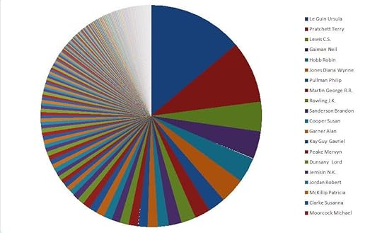 Ursula K. Le Guin emerged as the undisputed winner with over 50 votes difference from the next author. Terry Pratchett was also a clear runner-up, with over 50 votes difference from the next group of authors. This seems to at least somewhat contradict the argument that after Tolkien we’d have a big number of authors scoring roughly equally. I am wondering how the results would differ if Tolkien was not excluded, but, again, that’s a question for another day (for what it’s worth, I think that Le Guin and Pratchett would still be 2nd and 3rd respectively, with a clear difference).