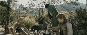 Now, if you know The Lord of the Rings well, this scene cannot fail but bring to mind the famous scene with Sam and Gollum in Book IV, Chapter 4, “Of Herbs and Stewed Rabbit”. After Gollum brings in rabbits for Frodo and Sam to eat, and sees Sam starting a fire, he goes into an anxious frenzy, telling Sam to put off the fire as it will attract enemies. But Sam has firm plans and isn’t going to change them. He responds: