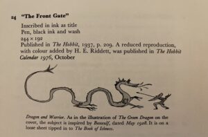 The catalogues booklet then moves to a traditional catalogue, explaining that the exhibition is arranged, “like Caesar’s Gaul” (!), into three parts: containing drawings associated with The Hobbit, The Father Christmas Letters, and The Lord of the Rings, respectively. There are no reproductions of images, bar a couple of monochrome details/scenes (see, for example, the “Dragon and Warrior” drawing below), but the catalogue describes the Hobbit illustrations as “bright and jewel-like”, singling out “Conversations with Smaug”.