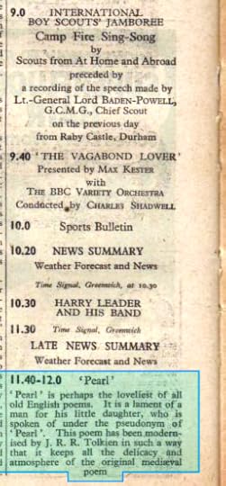 What I find fascinating is perusing the programmes preceding Tolkien’s ‘Pearl’ – one can imagine Tolkien tuning in to hear his own translation being read out, and perhaps catching some of the programming around it. That particular Friday, the programme earlier that evening included a recording of a speech by Lord Baden Powell, the founder of the Scout Movement, from what is described as the “International Boy Scouts’ Jamboree”, which, however, must be the Northern Counties Jamboree, at Raby Castle, near Staindrop, County Durham. I speculated in my 2008 monograph that Tolkien was at least familiar with scouting principles and learning, but we now know that he and his brother, Hillary, were definitely involved in the movement, having started three patrols of scouts at the Birmingham Oratory. I wonder whether Tolkien would have listened to Lord Baden Powell’s speech that evening, while waiting to listen to the broadcast of his translation of ‘Pearl’!