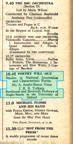 Tolkien’s actually was the 6th and last broadcast of the series. Here is the full list of subjects and contributors, all by University Professors, one of whom was Tolkien’s close collaborator and friend, E.V. Gordon: