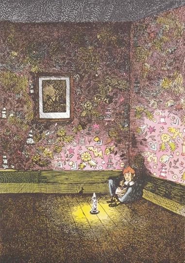 The first one is by Mervyn Peake. It’s his illustration of the nursery rhyme “Little Jack Horner”, from the book Ride a Cock Horse: And Other Nursery Rhymes[image error]Ride a cock-horse and other nursery rhymes (British Library Publishing). Peake’s Little Jack Horner is most certainly sitting in a corner, accentuated by the light of the candle which only illuminates the bit of the floor where he sits (complete with mouse!) and the fantastic wallpaper where the two walls meet immediately around him. There’s a framed drawing/painting on one of the walls, mostly in a non-lit spot, and Jack’s rather naughty-looking face is all the money. The wallpaper features different shades of pink and pastel green and yellow colours. We can see patterns which include a lighthouse, fish, a seagull, flowers, a star.