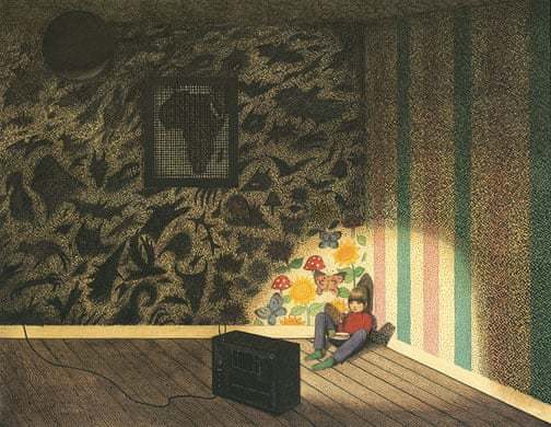 The story this picturebook tells is that of young Hannah, who wants her dad to spend time with her. She gets a toy gorilla for her birthday, who becomes a real-life gorilla at night, wears her father’s coat, and takes her out to see and do all the things her dad hasn’t had time to see and do with her: going to the cinema, visiting the zoo, having a meal in a café, etc. This particular image can be found towards the opening of the picturebook, which explores Hannah’s loneliness and isolation: instead of a candle, Hannah is sitting in a corner in front of a TV, which illuminates the floor and two meeting walls in exactly the same way as Peake’s illustration. Instead of sneakily eating plum pie, Hannah is having a lonely dinner (she’s holding a plate with a sandwich and an apple), once again without her dad. The wallpaper uses very similar pastel colours as Peake’s one: pink is clearly a deliberate choice here. But in the non-lit spots, it features instead rather scary creatures of the night, as well as the silhouette of a gorilla. Is the father-shaped gorilla (still to appear in the story) prefigured here as part of her dreams? He is definitely prefigured in the framed painting, which in this image shows pretty clearly a map of Africa.