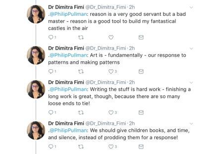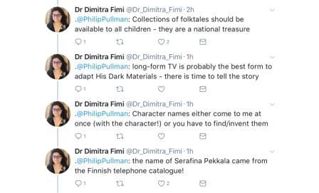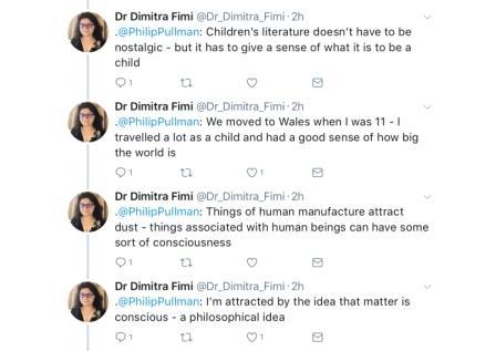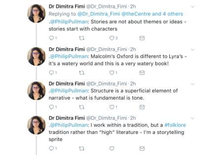 Pullman talked about the characters of La Belle Sauvage, the world of Lyra, children’s literature, folklore, and the craft of writing more generally. Here is my Twitter thread with quotations and comments from Pullman during the Q&A: