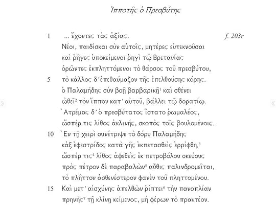 All other western-style, political-verse romances… are in ‘vulgar’ Greek (also called ‘impure Greek’ by the grammatikoi), reflecting the language as spoken in everyday life. But The Old Knight is composed in the high-literary ‘Atticizing’ register of the intellectual, professor or grammarian. Within this rarefied idiom, furthermore, the poem contains a rhetorical performance only the trained ear could have appreciated: that is, a chivalric romance – with a good deal of comedy – narrated with an epic fullness of expression, complete with Homeric syntax and diction. (p. 167)