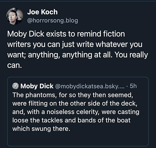 My friend Jonathan and I believe, I’d argue rightly, that pretty much everything can be related to Moby Dick. It’s a tome that can be used a sort of Bible, a touchstone, maybe a divination text. There’s an inherent mysticism to it. What is it but a battle between man and the unknowable, uncaring other, and what could be more horrifying? I don’t think it’s an accident that Chris Carter compares Mulder’s search for the truth to Ahab’s pursuit of the whale.