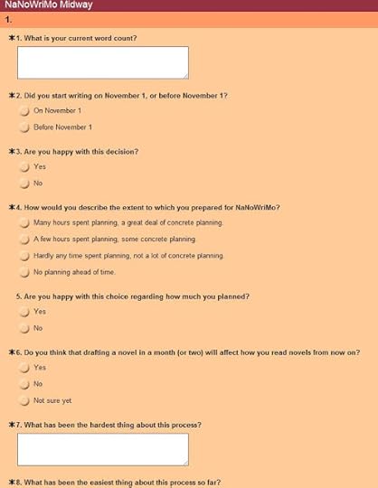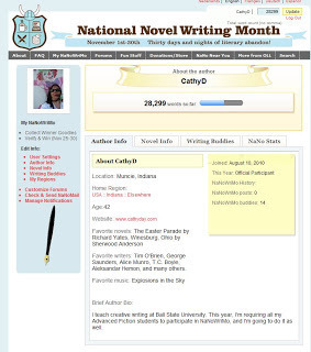 The results varied. At this point, my students should have been at about 25,000 words. (I wasn't quite there myself, alas.) Three students hadn't broken 20,000 yet. One student was already at 58,000 and was sprinting toward 70,000 words. Seven students were at 25,000 or above. Six students hadn't reached the half-way milestone yet.