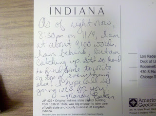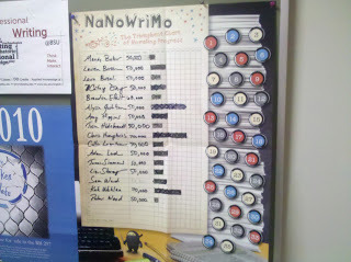 I walked around the room to find out how everyone was doing. "What's your word count?" Some people started in October and are farther along than others. At this point, one week in, they should be at about 25% of the goal or 12,500 words. Most were. Some weren't, but they recognized this and told me their plan to get back on track. I marked their progress on this handy-dandy poster I got from the Office of Letters and Light.