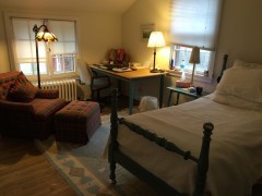 So far, what I like most about this residency is how anti-social you’re allowed to be. You can behave in ways that would be taken as rude under almost any other circumstance. Let’s say I leave my computer to walk into the kitchen to make a cup of tea and I’m still thinking about what I’m writing and I find that someone is already there. She’s absorbed in a book while she eats some cereal, doesn’t say hello how did you sleep are you have a good day how’s the writing going? She smiles and returns to her book. I can make myself a cup of tea and walk right out of that kitchen. Or I’m eating dinner with everyone at 6:30 PM, the only time of the day we all come together and eat a nice meal prepared by Chef Linda, served buffet style. It’s sort of like going to a dinner party every night, except you get to wear sweats and slippers if you want to. So, I’m at this dinner party in my slippers talking to the guy sitting across from me about, I dunno, the Lusitania or football or ice cream, and when he’s done eating, he stands up and says, “Back to work,” and I say bye and that’s that. No long goodbyes. No hard feelings. Everyone understands. If only real life could be this way!