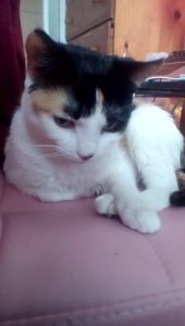 photo by Mama AnnaMama D said I was two when Mama Anna and the rest of the fam met me, but Mama D also told Mama Anna about some super teenage-y behaviors I exhibited that didn’t add up to grownup lady cats. Also, I kept growing. If you look at pictures from when the fam first met me, and then pictures of me later, you can see I am bigger. So, by best guesses, February 14th seemed like the best fit. One, it’s Valentine’s Day, and two, it was also the observed birthday of Big Sister Skye, whose real birthday nobody knew, because Skye was born wild, and there are exactly zero calendars out there. I am happy to share my observed birthday with Big Sister Skye. It makes the day doubly special. Okay, triply, because of the whole Valentine thing. I get lots of cuddles and lots of love every day, but more on my birthday. I got gushy food from Papa (he is my gushy food guy) and belly rubs from Mama Anna. Aunt Linda tried to pick me up but that’s okay. I know she loves me. I hang out with her sometimes, and not only because my cat tree is in her room. I have a water bowl in there, too. Also a litterbox.