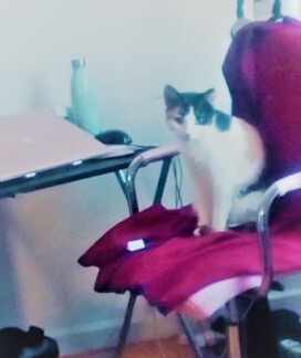 Keeping Mama Anna’s seat warm.I, purr-sonally, did not get to go to Aunt Mary and Uncle Brian’s hotel, which I am told was very nice, with a big couch, so there was room for me, and pets were allowed, so I hung with my special mousies that evening. The humans did all agree, though, that the next visit has to be soon, and at Aunt Mary and Uncle Brian’s house, and that I have to come along, because separation anxiety. This means that A) I will get two car rides (there and back) and B) Mama Anna will need to harness train me, so that when I get out of my adventure cave after the car ride, she can keep eyes on me at all times in a new environment.. I should probably also mention that While Aunt Mary and Uncle Brian have my Cousin Andy (who is a young grownup, and will be getting married to my Cousin-to-Be Leah, and moving to his own house next year; dibs on his room when we visit after that) but also my Cousin Aiden, who is a Golden Retriever. That is a kind of dog, who will not be getting married and thus will stay licing in that house. I am not sure if he knows a lot of cats (probably not) so only one of us will be free range at any given time, and I will be on the lead when it’s me.