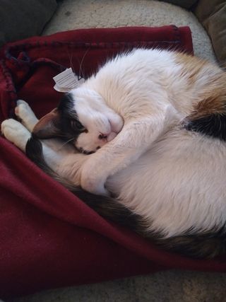 My Best Sleep Spot is: Also Aunt Anna. Specifically on her hip if she is on her side, or her midsection if she is on her back. That is a way to say “I love you” in cat, and also the best way for me to see what she is watching on her tablet screen. Best friends watch TV together, right?
