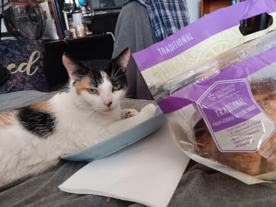 Here is what happened: It was back when Papa was just starting to get better. He asked for a roast chicken in the grocery order because he needed protein to get better. He put it On The Bed, Where I Already Was. He put the dish between me and the chicken. If I look like I am about to throw beans, it is because I was. Can you believe he did not give me any chicken? He did not. I did, however, get salmon gushy food, so it is arguably equal which is why he was not mauled by a tiger in his sleep. He said something about bones and seasonings, but blah blah blah. A chicken in every cat, that’s my philosophy. (Yes, I did jiggle the plate to remind him I wanted some.)