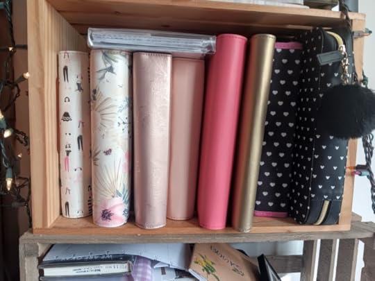 Secondly, pertinent to the image above, we have the revamped planner lineup. Here i s a fun fact about Housemate: she likes the mystery boxes/grab bags Michaels sometimes does. There were a few in our local Michaels this past weekend, and it happened to be a buy one, get two free deal. So, we got three. Inside, there were two Happy Planners, both dashboard layout. One dated, one not. I will be destashing or giving away the undated one, but the dated one has replaced the horizontal blank boxes A5 rings I had been using, but not reaching for much at all this month. For those who are new here, I do have a visual impairment, and blank pages are not my friends. Nice, dark lines, however, are my favorite. I will share the layout and a sample spread later.