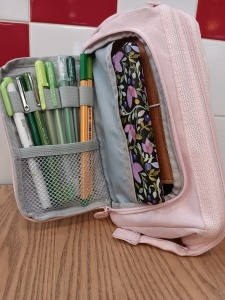 I am currently going with a green theme for spring. We’ll see if I want to make a change at the start of the new month. The flowered notebook has perforated pages, which makes it double as a notepad or come in handy when somebody needs a piece of paper out in the wild. There is an additional zip pocket in the back, which holds a selection of Crayola SuperTips in pastel colors.