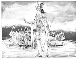 Meantime, Duruodhana gets jittery worrying if Arjuna would choose Sri Krishna’s million sons to their advantage. Surprising to Duryodhana, Arjuna the dear devotee of Sri Krishna says, 'My Lord! Whether you take up weapons or not, we want you to be on our side'. Subsequently, Arjuna requests Sri Krishna to be his charioteer and Sri Krishna accepts the same. Duryodhana feels relaxed and happy. He thinks with an affirmative question, “What is the point of having Sri Krishna who is not going to take-up weapon and fight?”