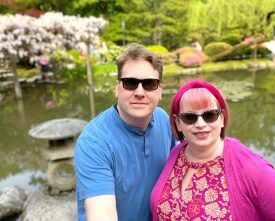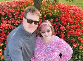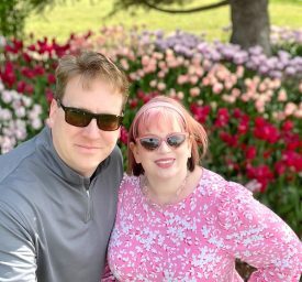 Glenn and I with orange and red tulips, La Conner