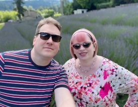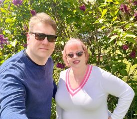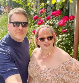 Glenn and I at Apple Farms wineries with roses and lavender