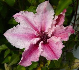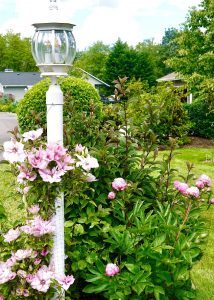 Part of the garden: pink clematis and peonies on lamppost