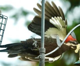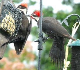 Two pileated woodpeckers at a feeder meant for a much smaller bird