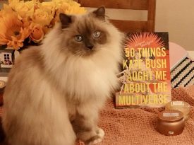 Karyna McGlynn’s Got a Great New Book OutAnother coping mechanism of mine during stress is reading, and I had a wonderful new book to enjoy this week, pictured to the left. My literary cat Sylvia poses with Karyna McGlynn‘s new book from Sarabande, 50 Things Kate Bush Taught Me About the Multiverse, which is a fun, flinty, 90s-nostalgic Kate Bush love letter with terrific titles like “I Wake Up in the Underworld of My Own Dirty Purse,” which starts: