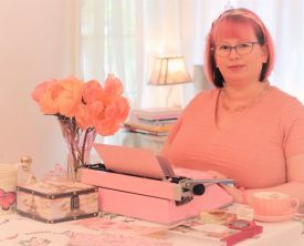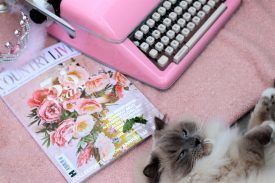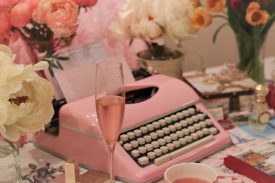 Writer with pink typewriter and pink peonies