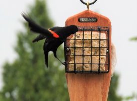 I’ve always liked red-winged blackbirds, and lately they have decided to visit my back deck. Here are three shots, two of which show exactly how much beautiful color they have.