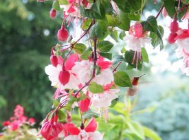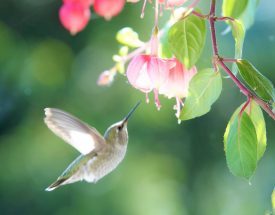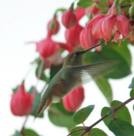 Hummingbird hovering at fuchsia flowers