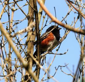 Towhee protected by spiking branches