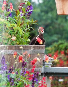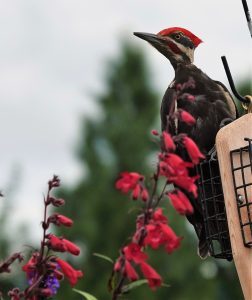 Pileated Woodpecker with red flowers