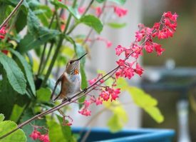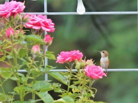 roses and perched hummingbird